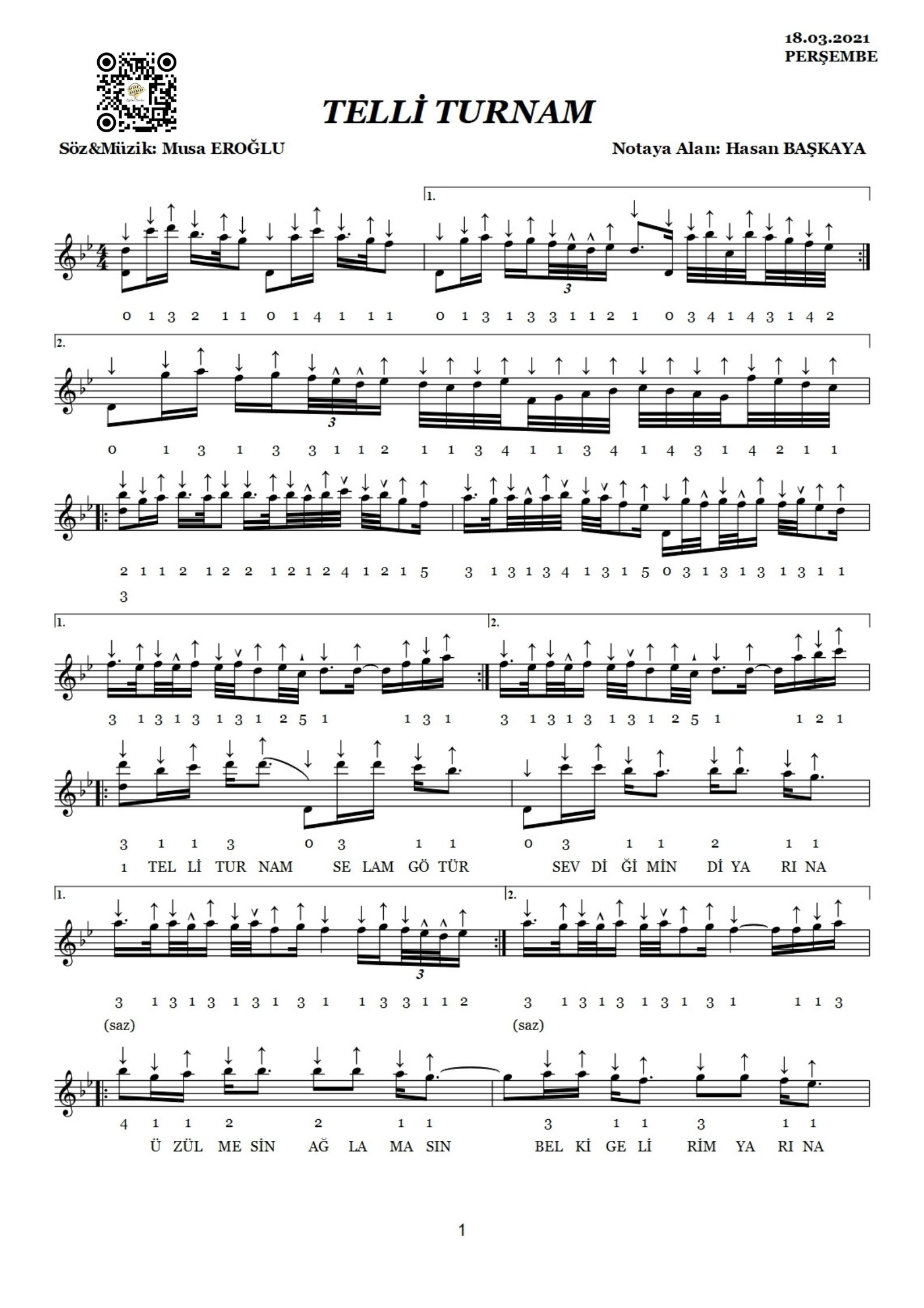 TELLİ TURNAM SELAM GÖTÜR Nota 1. Sayfa